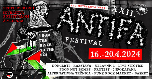 x 22. ANTIFA fest, ki poteka od 16. do 20. aprila na Metelkovi; izpostavljamo Infokafano Palestine Solidarity: Anti-Colonial and Jewish Perspectives v petek, 19. 4., ob 19.00 v a.infoshop