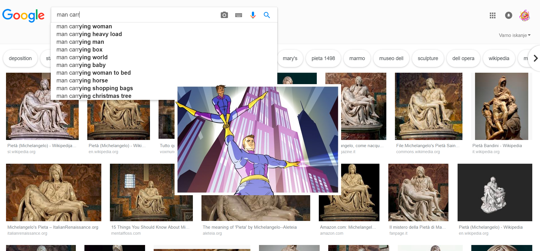 Načinov, kako eno telo lahko nosi, odnese drugo, je veliko. Eden lažjih je nošnja v naročju. Kakšen je lahko padec v naročje oziroma kakšno je lahko telo v naročju? Objemi so mnogih sort in tort. A tu vedno uporabijo isto primem-odnesem naročje. Nikoli punca ne nosi fanta. To je za njih tudi nek način prehoda iz ene scene v drugo. Punca se blazno smeji, pride fant, jo sname v naročje in odnese. Dekle izvede dejanje na trapezu, pride fant, jo ustavi za gleženj, prestreže in odnese. Naročje je vedno enako. Naloženo dekle se oklepa vratu, njene dlani se obe po celi površini prilegata njegovemu hrbtu, nogi sta skrčeni in bingljata, nikoli se nobena temu ne upre. Njen pogled v publiko je precej neizrazen ali pa ga ni, v primeru, da se jo odnese »mrtvo« v zadnji stranski izhod.