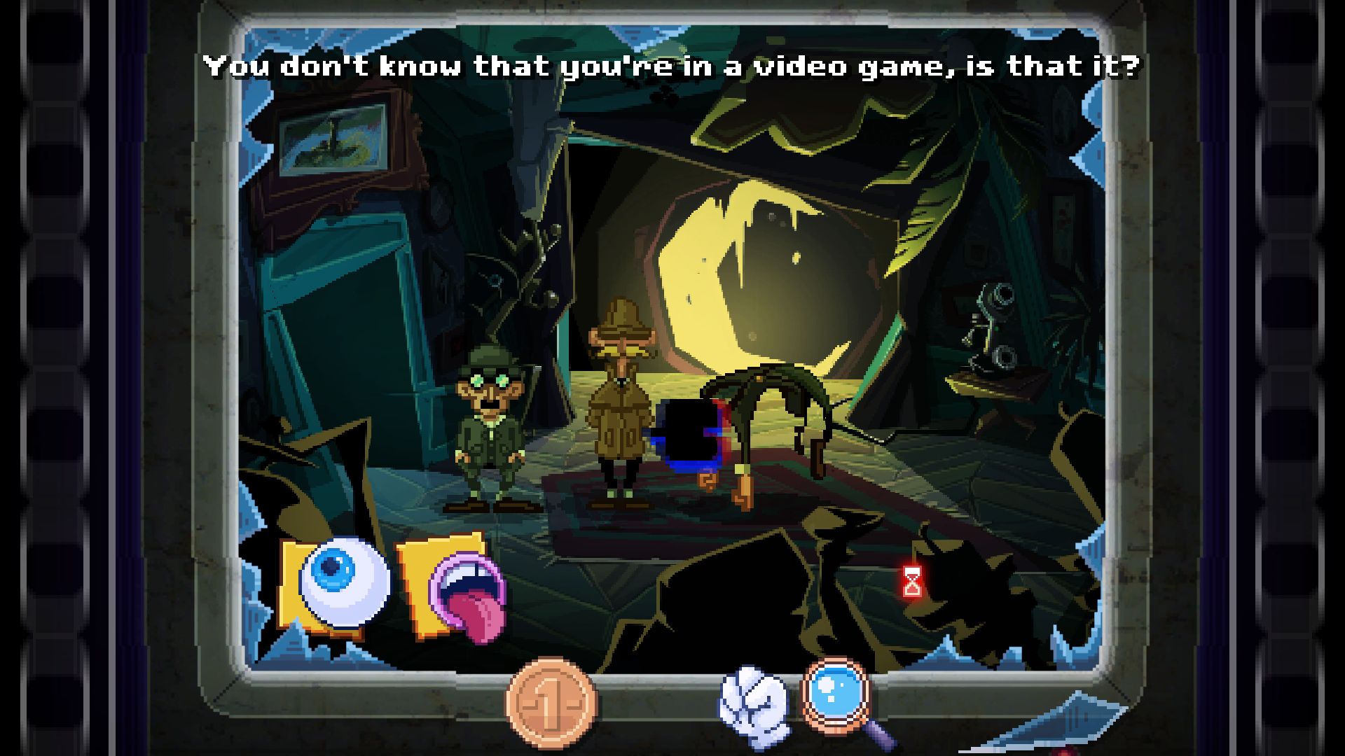 Najosnovnejši okvir igre predstavlja izvršljiva datoteka, v kateri nadzorujemo računalniški kazalec. Premike ves čas spremlja nadležni pripovedovalec, ki nas prepričuje, da program, v katerem smo se znašli, ni igra. Vse, kar naj bi torej storili, je stisnili ikono za izhod in program zapustili. Toda ali naj objestnemu komentatorju verjamemo? V njegovem glasu je vendarle razbrati kanček neiskrenosti. Kaj pa, če bi raje pritisnili gumb za igranje? Tega nam igra izmakne in nas zopet hitro usmeri na izstop. No, kot se je slavno izrazil Michael Jordan, stvar na tem mestu postane osebna. Prekleti knof za pogon zgodbe bomo pritisnili, pa naj stane, kar hoče.