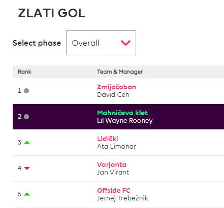 Trenutni top 5 ZLATI GOL FANTASY PREMIER LIGE (auto-join link):