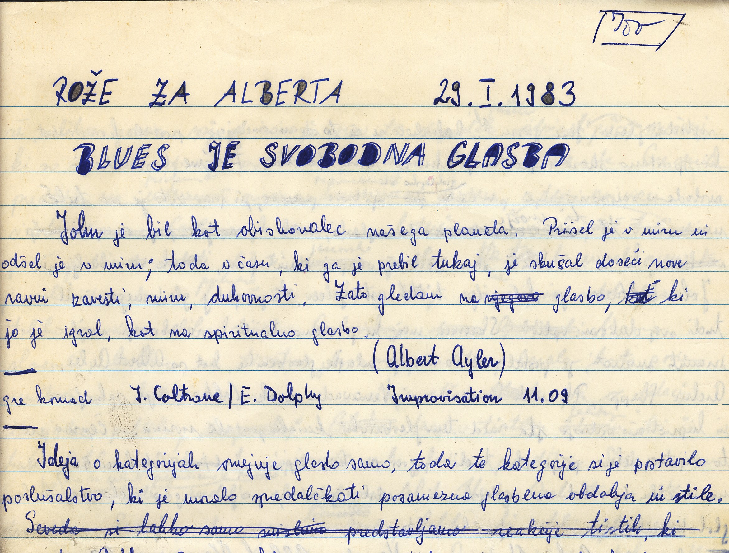 op. na sliki zgoraj: prva oddaja Rože za Alberta, oddaje o sodobni improvizirani glasbi, rokopis.