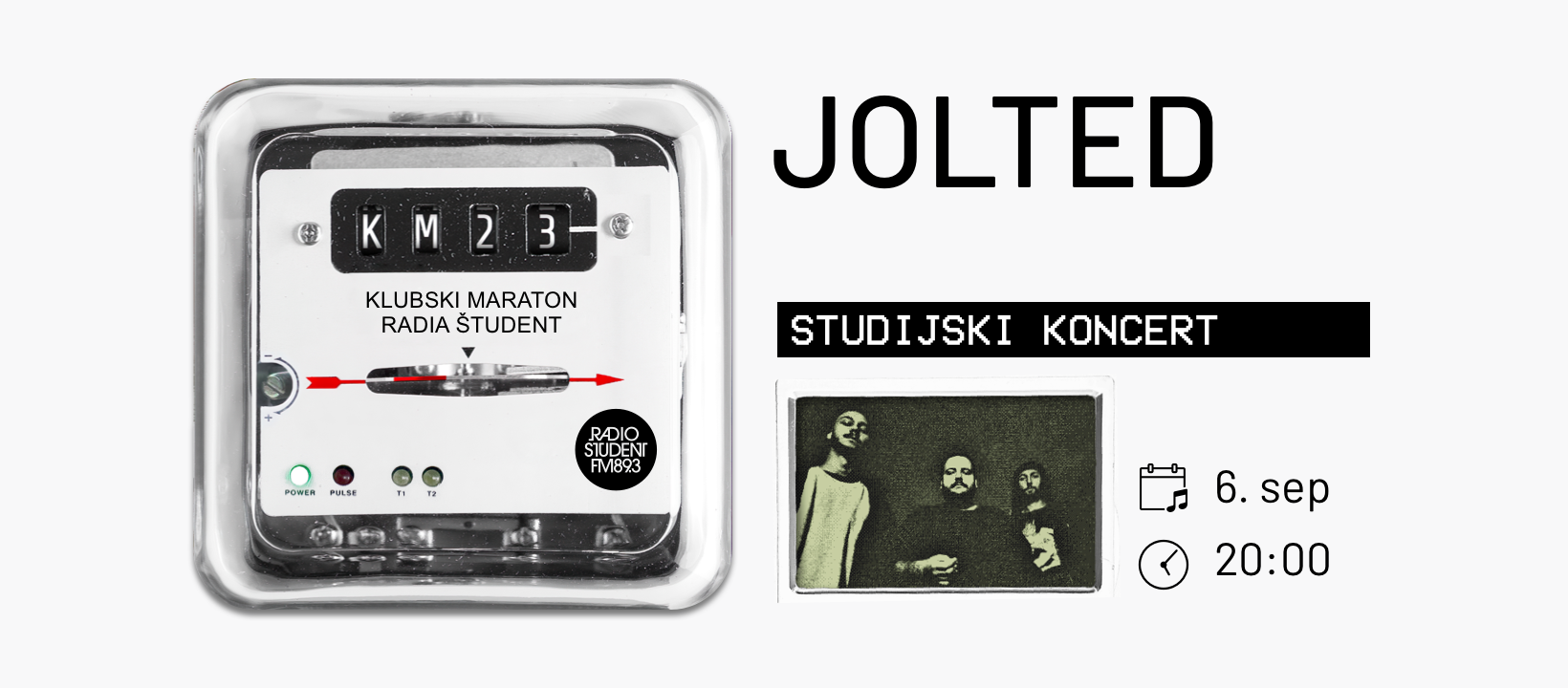 Na zaključnem studijskem koncertu letošnjega Klubskega maratona Radia Študent nas bodo strli sunkoviti težkokategorniki Jolted. V sredo, 6. septembra, ob 20.00 v živo iz studiev Radia Študent, v etru na 89,3 MHz in v živem videoprenosu!