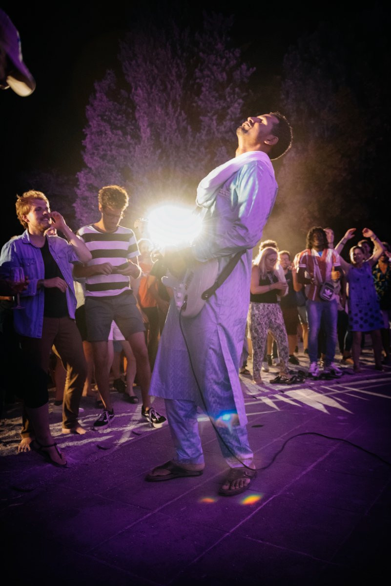 Na zadnjem od koncertov, ki so se odvili na grajskem dvorišču, smo poslušali zasedbo kitarista Mdoua Moctarja iz Nigra. Moctar preigrava svojevrstno različico rocka nomadskih ljudstev iz zahodnega dela Sahare, ki se ga je v svetu prijelo ime puščavski blues. Glasbeniki so napolnili večerni zrak s hipnotičnimi zankami melodij, ki jih je prežemalo odprto odzvanjanje strun, ujeto v repeticijo kotalečega se ritma bobnov. Moctarjevemu visokemu petju so v nižjem registru v odgovor klicala grla preostalih članov zasedbe, njegovi prsti pa so neumorno ubirali pot mimobežnim melodijam in zazankanim repeticijam, ki so v skladbah pospeševale svoj drveči tempo.
