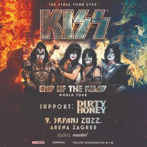Razmeroma mlada zasedba Dirty Honey, ki je nastala v Kaliforniji leta 2017, je navdih za ime bojda dobila po nekem intervjuju z Led Zeppelin, v katerem je Robert Plant govoril o nečem v zvezi z umazanim medom. In v bistvu ni samo ime benda tisto, ki spominja na Led Zeppelin, tudi glasba je takšna. Kvartet je odpičil 45 minut in se predstavil v res dobri luči. Odigrali so večino pesmi s prvenca Dirty Honey, pri tem pa občasno zveneli kot Led Zeppelin, občasno kot Jimi Hendrix in verjetno še kdo, skupni imenovalec pa je ta, da so zveneli res dobro, še posebej odlični vokalist Justin LaBelle. Za razliko od Kiss se Dirty Honey res lahko zanesejo samo na glasbo – nekaj luči, a nobenega dodatnega odrskega šova, celo komunikacija je kratka. Svoj posel so opravili zelo dobro, in ni čudno, da se že celo poletje potikajo po Evropi ali kot predskupina Kiss ali pa kot predskupina Guns N' Roses. A tudi po nastopu Dirty Honey, ki nas je navdušil, je bilo jasno, da vsa Arena čaka samo na ene in edine Kiss, ki so se v svojih skorajda petdesetih letih delovanja prvič in verjetno tudi zadnjič ustavili v Zagrebu na Hrvaškem.