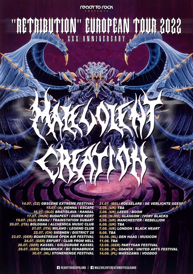 Po kratkem premoru so oder zasedli Malevolent Creation. Ali pa vsaj njihov »tribute band«. Naj pojasnimo. Zasedba prihaja iz New Yorka, muziko pa ustvarja že od druge polovice osemdesetih let. Velja za eno pionirskih zasedb, ki je uspešno kombinirala death in thrash metal. V njeni zajetni diskografiji, ki obsega kar trinajst studijskih dolgometražcev, za kultni veljata prvi dve plošči, The Ten Commandments in Retribution. Slednja letos slavi trideset let, kar je zasedba izkoristila za turnejsko udejstvovanje po ZDA in Evropi. In zdaj pridemo do tistega dela zapisa, v katerem smo zasedbo označili za »tribute band«. Na odru namreč ni stal niti en sam originalen član zasedbe Malevolent Creation, kaj šele član, ki bi sploh igral v skladbah na plošči Retribution.