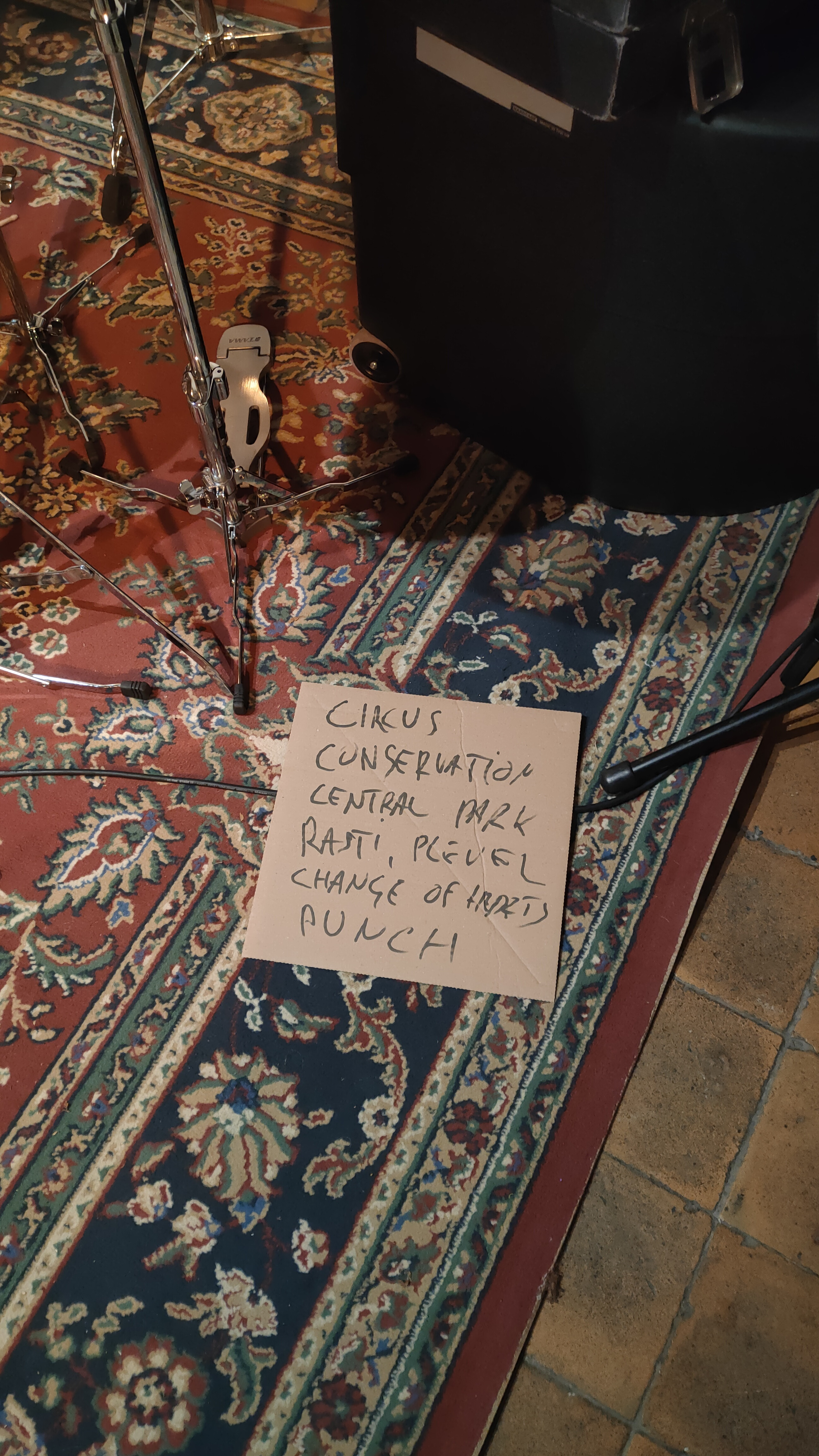 Večer je odprla skladba na listu s tal, naslovljena Circus, z basovskim rifom kot ogrodjem za ritmično lomljeno, kompleksno lovljenje za koreni med vsemi tremi glasbeniki. Sledila je žlahtno popreproščena Conservation, zaznamovana z lirično štiritonsko akordno progresijo, nekakšnim zatišjem pred nemirom, ki se je razprl v nadaljevanju. Zdaj se je glasba najbolj približala vrhuncem RIO pesmovanja. Intenziven, padajoč basovski rif dveh akordov je odprl prostor Resnikovemu energičnemu saksofonu, ki se je z basom zapletel v komponirano soglasje. Prelom je prinesel Gąsiorkov bobnarski solo, ki je z manipulirano uglasitvijo kotlov in razpršenim udarjanjem ustvaril jazzovski suspenz, počasi razlivajoč se v skoraj neobstojne pulze.