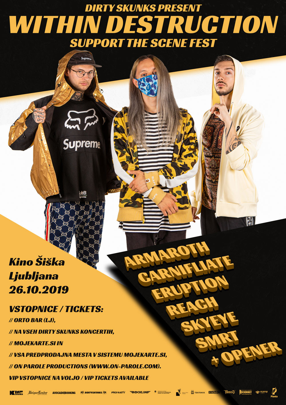 Oktober je v Ljubljani in nasploh v Sloveniji ponudil kar lepo število koncertov vseh živih žanrov v vseh mogočih klubih. A kljub temu je eden od dogodkov resnično izstopal, namreč Support The Scene Fest, ki se je preteklo soboto, 26. oktobra, v veliki dvorani oziroma Katedrali Kina Šiška v Ljubljani. Koncertni večer je predstavil osem domačih tako izkušenih kot manj izkušenih bendov ekstremnih zvenov in nam skušal pokazati ter dokazati, da tudi tako veliko dvorano, kot je ta v Kinu Šiška, lahko lepo napolnijo tudi bendi manjšega kalibra in tudi domači bendi. Za idejo je zaslužen tako headlinerski bend Within Destruction, ki se je že pred nekaj leti odločil za zgolj en ekskluzivni nastop v Sloveniji na leto, ki je tudi vedno nekaj posebnega, za kar so zaslužni Veseli Dihurčki, kolektiv, ki redno organizira koncerte v Ljubljani, ob podpiranju tujih imen pa vselej poskrbi tudi za domače, tako manjše kot večje bende.