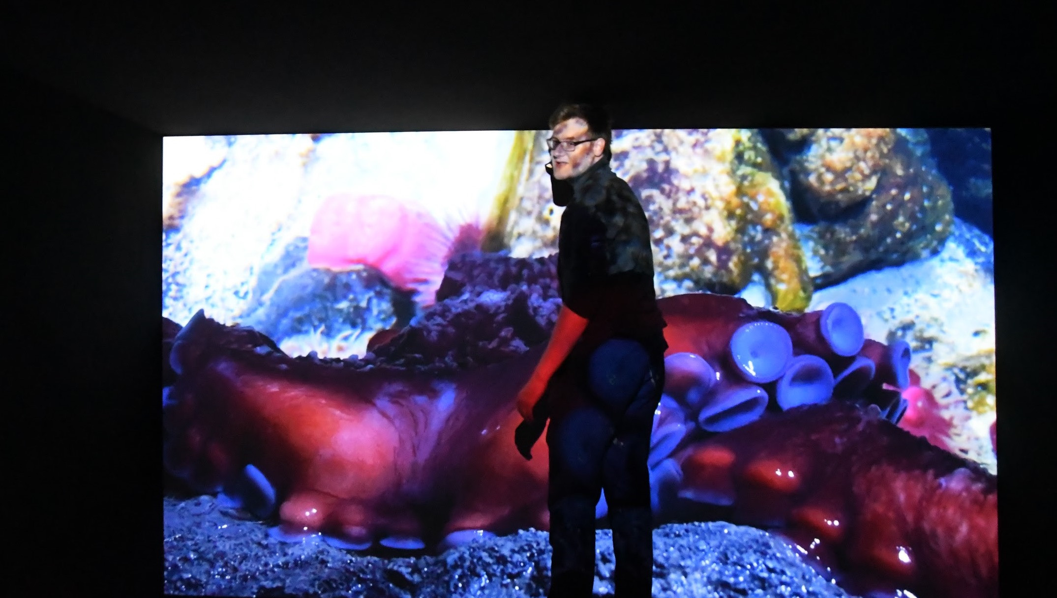 Pritegne nas ena od dveh večjih projekcij, postavljena poleg zidu ogledal. Sopostavitev meri na spoznanja znanstvenikov, da delfini in velike mante verjetno prepoznavajo lasten odsev kot tak. Prvi sloj video projekcije krojijo scene podvodnega sveta in organizmov v intenzivnih barvah. V drugem sloju pa se nahajajo prosojni človeški igralci, ki v interakcijah plesnega in govornega tipa preko prvega krojijo paralelno zgodbo. Študentje recitirajo Emily Dickinson, Hermana Melvilla, Rachel Carson in druge, katerih pisanje je zaznamoval ocean. Starejša oseba skuša zaplesati z jastogom, ki pa njene intence ne zaznava. Delo preko poezije, ne didaktike, hkrati govori o nezdružljivosti človeških in nečloveških senzibilnosti in izjemnem manku jasne relacijske, postantropocentrične etike. Skrajno nepretenciozni koncept in izvedba, všečno.