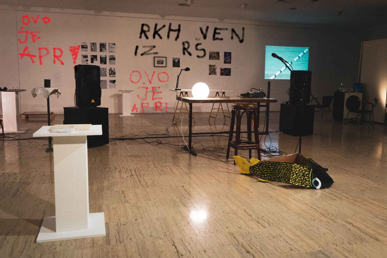 Mnogi so na razstavi to heterogenost začeli razpirati povsem izvrstno. Od Ugrabitve frekvence Lobode in Savič, torej radijskega noiserskega instrumenta, do Kopačeve glasbe, morda tudi poezije Okorna, z gotovostjo Sušnikove video montaže. Najneposrednejši in zato tudi publiki najzanimivejši artefakt je bil gotovo urednikov dnevnik: od številk in alinej ter ključnih besed do risb, čačk in zamazanega črnila.