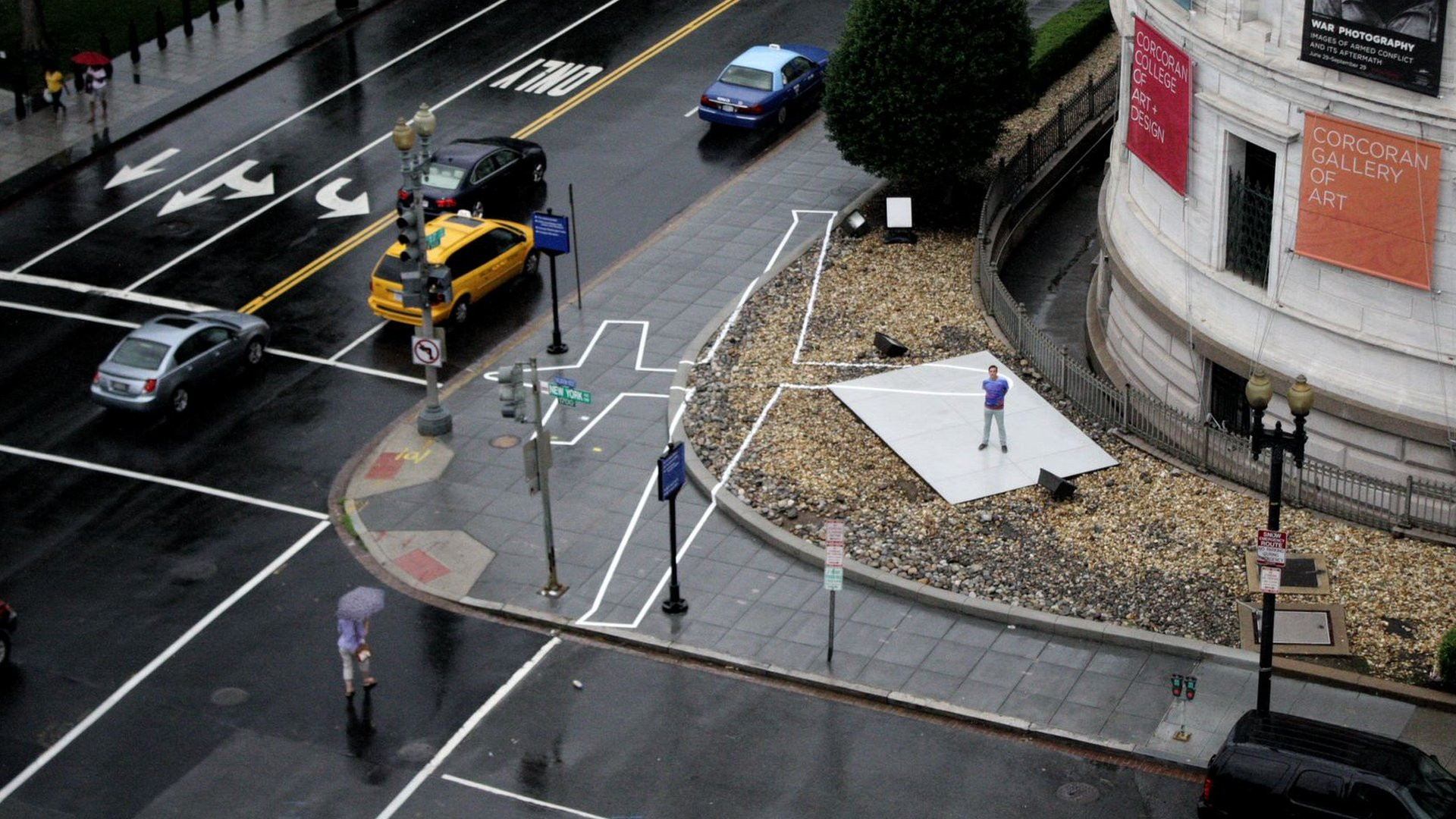 Kot pove sam naslov, V senci brezpilotnega letala, se Bridle v Aksiomi razstavlja in predstavlja predvsem s projekti, ki so vezani na dronifikacijo kulture. Eden izmed projektov je tudi preprosta street art metoda javne intervencije: risanje modelov brezpilotnih letal na javnih površinah v velikosti 1:1, kar naj bi ustvarilo učinek direktne konfrontacije in umestitve nevidnega aparata v polje vidnosti.