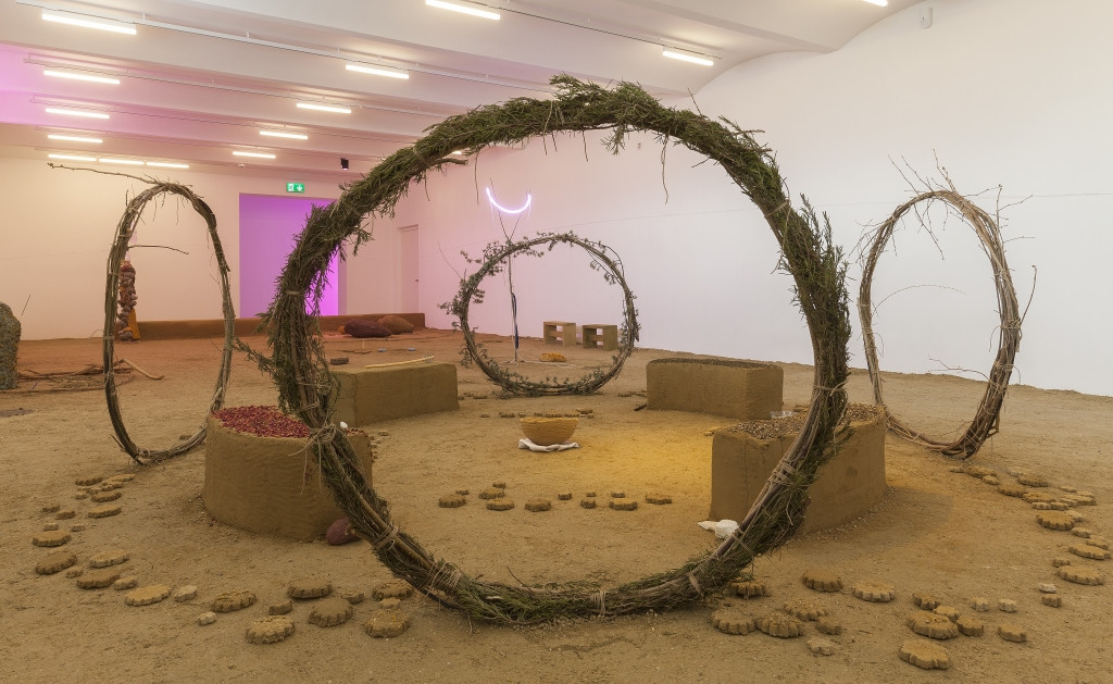 V prvi sobi v kleti Secesije smo soočeni s krožnim dopasnim zidkom iz gline, ob katerem pot obhoda razstave vodi v naslednji prostor, iz katerega slišimo pridušeno brenčanje čebel. Preden nadaljujemo pot po instalaciji, lahko v krožno strukturo vstopimo – če to želimo storiti. Krožni zidek označuje pot prehoda iz sterilnega okolja galerije v simbolni mistični svet umetnice, ustvarja portal med zunanjim in notranjim ter izpostavlja njuno medsebojno napetost. Instalacija posnema zgradbo tradicionalne afriške hiše, ki je sestavljena iz notranjega prebivališča in zunanjega prostora, namenjenega molitvi. Z vstopom v instalacijo se znajdemo v notranjosti prebivališča, vendar nas nadaljnji obhod vodi v zunanjost – na notranje dvorišče, ki uprostori simbolno mistično bistvo umetničinega sveta, prepletenega z običaji in prakso njenih prednikov.