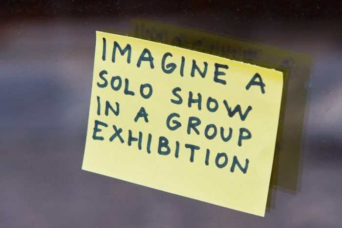 Z bledo rumenim samolepilnim lističem, prilepljenim na okno, ki narekuje, naj si predstavljamo umetnost v javnem prostoru, se je ogled pričel, še preden smo vstopili v galerijo. Samolepilni lističi so se nato ponovili v mnogih variacijah, ki obiskovalko naprošajo, naj si predstavlja umetniško delo, enkrat kip, drugič kup datotek na mobilnem telefonu. Avtorica Nataša Berk ne daje natančnih navodil za narekovane miselne kreacije, temveč le namigne, naj si zamišljamo video, barvne fotografije ali skulpture, ki bodo v prostoru naslednji dan. Avtorica s tovrstno postavitvijo od gledalca ne pričakuje, da delo dokonča, nadaljuje ali dopolni, temveč da zasede vlogo umetnika in delo ustvari. S tem izpostavi pogost očitek sodobni umetnosti, da jo vendar lahko naredi vsakdo, z razstavljenimi objekti pa to tezo postavi na preizkušnjo.