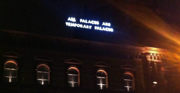 Torej: “vse palače so začasne palače” in ne kot sem sprva zmotno prebral: “vsi prostori so začasni prostori”. Ob tem spoznanju sem doživel neko popolnoma novo zadoščenje, vendar ostrejšo kontemplacijo. V lucidno-poetičnem napisu Montgomeryja je podana kritika, ki odlično odseva konstantno stanje premeščanja pozicij moči, skozi zgodovinske migracije kapitala. Ukvarja se torej s stavbo kot simbolom moči, vendar le začasnim simbolom moči. Umetniška inštalacija torej nosi aktivističen naboj skozi preizpraševanje lokacij pozicij moči.
