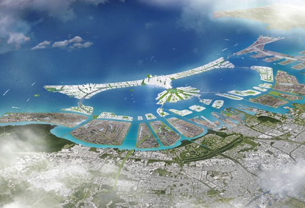 Severni del Džakarte je že dva metra pod gladino morja. Prenova oziroma vrsta natečajev, ki spremljajo mesto v njegovih najtežjih časih, predvidevajo poleg 40-kilometrskega vodnega nasipa tudi sedemnajst umetnih otokov in novo glavno mesto. Nepremičninske investicije na umetnih otokih naj bi krpale finančno breme prenove in izgradnje vodne zapore. Visokoleteči del projekta — otoki v konstelaciji orla, nacionalnega simbola Indonezije — se šele izpopolnjuje v fotomontažah, medtem ko se prenova vodne zapore — v obliki finančne in tehnične pomoči bivši koloniji, nacionalni simbol Nizozemske — že izvaja.