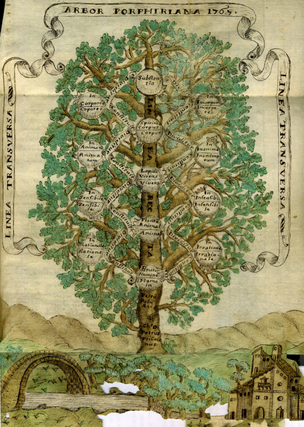 Da bi prišli do definicij pravnega slovarja, je treba skočiti kakšnih sto let bližje današnjemu času, do Porfirija, ki je napisal Uvod k Aristotelovim Kategorijam. Na njihovi podlagi je konstruiral prikaz, imenovan Porfirijevo drevo, ki je skozi srednji vek vztrajalo kot eno izmed osnov logike in logične metaforike. Natančneje, gre za shematično demonstracijo Porfirijevega preoblikovanja Aristotelovih sestavin problemov in propozicij, med katere je dodal diferenco. Drevo kot »lestvica biti« ali tudi scala praedicamentalis deli rodove na vedno določnejše vrste glede na specifične razlike, ki so lastne tem vrstam. Definicija neke specie je po Porfiriju kombinacija genusa in diference. Genus in specie sta v odnosu nadpomenke in podpomenke, saj rod glede na vrsto ni nič drugega kot nadrejeni pojem na drevesu. S tem pridemo do intenzijske definicije v Pravnem terminološkem slovarju, ki pojmu dodeli njegovo mesto, tako da kombinira njegov nadpojem in konstitutivno razliko. 'Pravna vrednota' je tako denimo opredeljena kot tisti etično zaželen cilj, za katerega je specifično, da ga priznava in varuje pravo.
