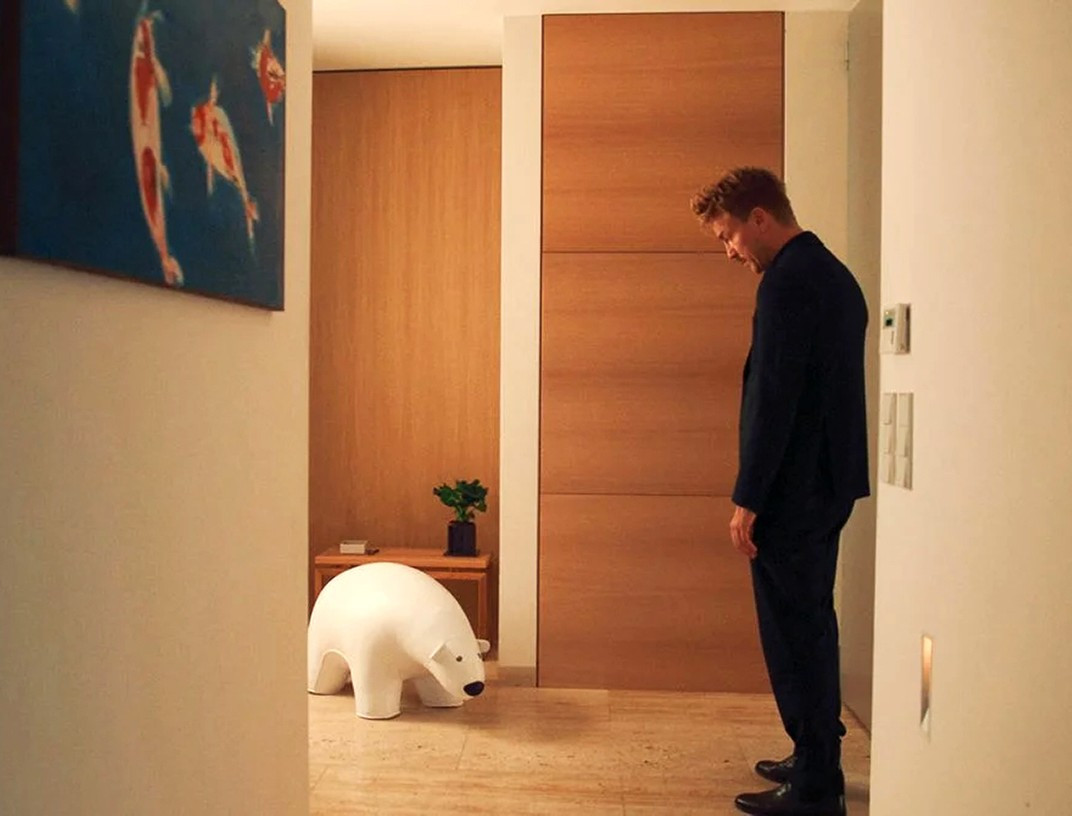 Scenarij deluje v neločljivem tandemu z vizualno podobo filma, ki jo zaznamujeta simetričnost in modernistični minimalizem. Matthiasovo brezosebnost tako dopolnjuje sterilnost filmske kulise s hladnimi, skrbno oblikovanimi interjerji, v katerih ni prostora za napake – in pogosto tudi ne za resnično čustvovanje. Njegov dom denimo deluje kot razstavni salon, luksuzen in brezhibno urejen, a brez sledu pravega življenja. Wengerjeva tragikomedija se tako izriše kot prepričljiva metafora človeške odtujenosti, ki je posledica pomanjkanja pristnega stika. To se zrcali tudi v izdelanih stranskih likih, Matthiasovih strankah, ki ne potrebujejo zgolj družbe, temveč želijo predvsem vzbujati vtis svoje družabnosti v očeh drugih.
