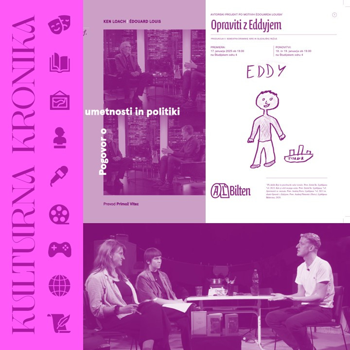 V današnji Kulturni kroniki sprva prisluhnite komentarju k dogajanju in novi knjižni izdaji, ki ga je pripravil Metod; nato intervjuju z Louisom, ki sta ga opravili Laura in Nastja; za konec pa še pogovoru z režiserko gledališke predstave Opraviti z Eddyjem Julijo Urban.
