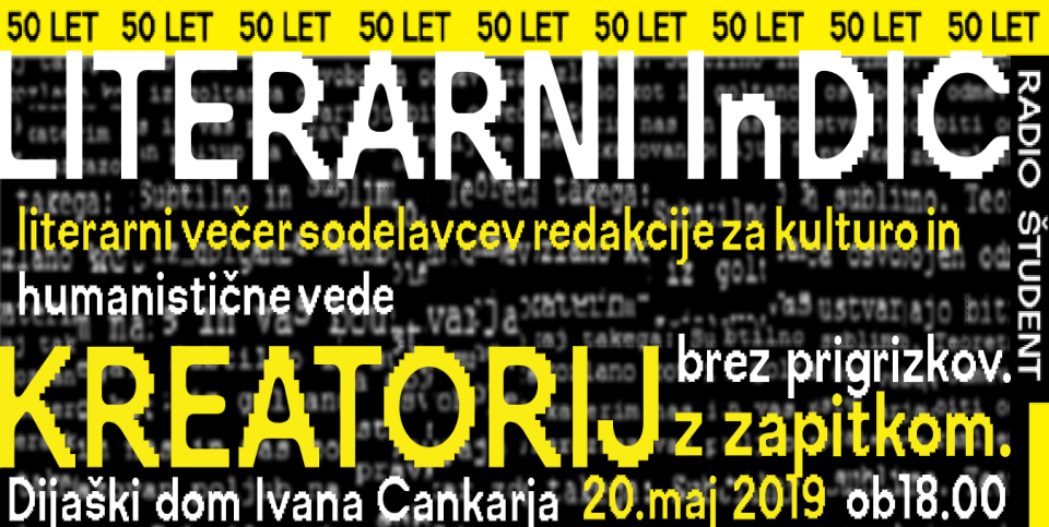 Cenjeno skupščanstvo. V imenu kulturno-humanistične redakcije toplo vabljeni na nocojšnji Literarni InDic, dogodek v sklopu 50-letnice Radia Študent, kjer boste lahko prisluhili literarnim umotvorom in žvrgolijam sedanjih in nekdanjih sodelavcev Redakcije za kulturo in humanistične vede. Literarni večer se prične ob 18. uri v Kreatoriju Dijaškega doma Ivana Cankarja. Več o njem pove naš sodelavec, organizator in nastopajoči Vid Bešter.
