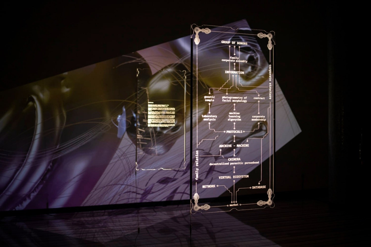 Lepo pozdravljeni v četrtkovih Kulturnih novicah. Minuli ponedeljek je bila v Galeriji Kamera na sporedu otvoritev intermedijskega projekta umetnikov Aljaža Rudolfa in Eve Smrekar z naslovom FaceOrFactory. Projekt je v osnovi raziskovalna platforma in hkrati korporacija, ki na podlagi podatkov iz biometričnega arhiva različnih oseb, kot so na primer obrazne poteze, DNK, emšo in tako naprej, skuša ustvarjati nove obraze. S tem avtorja postopno razvijata obraz kot kompleksen teritorij genetskih, pravnih, kozmetičnih, ekonomskih in političnih razmerij.