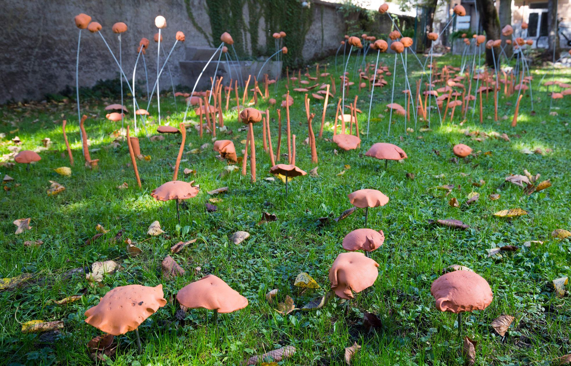 Bolj fizično, materialno in otipljivo interpretacijo pokrajine pa bo moč izkusiti v instalaciji Rastje kiparke Polone Demšar, ki se bo ob 18. uri otvorila v Galeriji Veselov vrt - na vrtu na dvorišču Komenskega 8. Po travniku je umetnica porazporedila oziroma posadila glinene oblike, ki spominjajo na rastline, alge, rože, gobe in plodove. Izhodišče umetnice je čutno, saj izhaja tako iz poznavanja lokacije, s katero upravlja Društvo likovnih umetnikov, kot tudi ročne obdelave gline, ki po besedah umetnice omogoča neposredni osebni vtis misli v material. Artefakti so izdelani iz neglazirane gline in tako dopuščajo vodi, da jih prepoji, nekateri od njih pa so postavljeni na železne palice. Vendar na način, ki omogoča odprtost instalacije do vplivov narave, vremena in obiskovalcev: