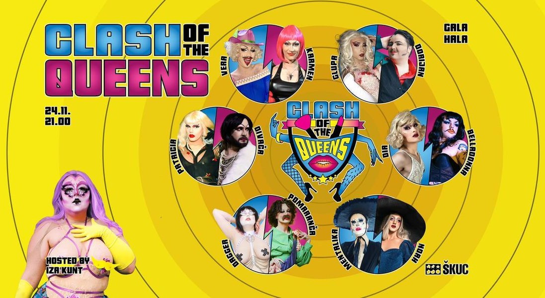 V studiu Radia Študent bomo v prihajajočih minutah priča gladiatorsko bleščičasti vojni. V pohotni areni Gale hale se 12 slovenskih kraljic preobleke poteguje za titulo Dive sinhronizacije ustnic in večno slavo na kvir sceni. Zmagovalko na tekmovanju Clash of the queens pa bo določila publika, ki bo s svojimi mobilnimi telefoni po vsakem dvoboju glasovala za zmagovalko!