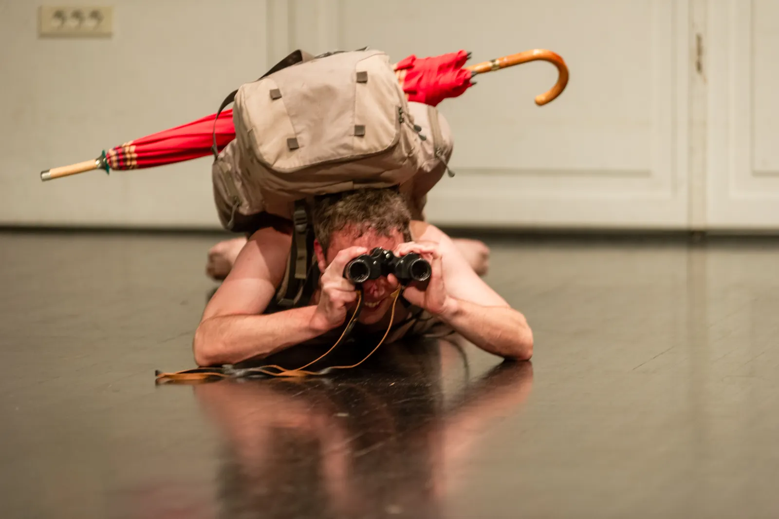 Pri njegovih dogodivščinah sta mu pomagali še šepetalka in asistentka Pehta, ki ju je izbral iz publike. Šepetalka zato, da mu je pomagala pri navajanju vrhov in njihovih nadmorskih višin, Pehta pa mu je pomagala z napornejšimi opravili. Performer je namreč potem, ko je preplezal del stene, začel z drugim delom predstave. S pomočjo sodelujoče gledalke oziroma Pehte si je na hrbet oprtal velikanski nahrbtnik, s katerim je nato kot polž lazil po tleh. V nahrbtniku je bilo štirinajst polen, ki so performerja tiščala k tlom, s tem pa oteževala njegovo premikanje in povzročala, da se je drgnil ob tla.