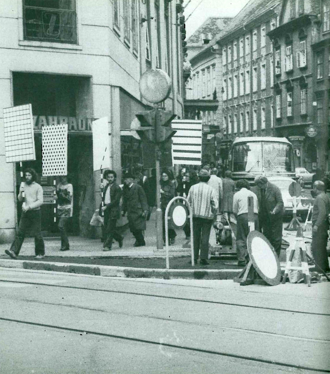 Na dveh fotomontažah, postavljenih na nasprotnemu zidu Galerije Alkatraz, pa smo obiskovalci spet lahko videli ti dve skupini, vsako s svojimi oznakami, izrezani iz urbanega okoliša Gradca iz sedemdesetih let in postavljeni na belo podlago, vsaka na svoji fotografiji, ki okvirjeni visita druga ob drugi. Tovrstna, dokaj enostavna, vendar precej učinkovita operacija razdvajanja in izdvajanja je bila dovolj, da pokaže, da so si telesne geste ter znakovna obeležja teh dveh skupin, ki sta zaposleni z dvema, na videz povsem različnima aktivnostma – namreč, z umetniškim protestiranjem in popravljanjem infrastrukture mesta -, tako podobni, da bi ju lahko zamešali. Tako se porajajo cele serije kompleksnih vprašanj o odnosu umetnosti in dela ter umetnika in delavca, pri čemer kontekst revolucionarnega potenciala umetniškega dela oziroma delavnega razreda nikakor ne smemo izgubljati iz vida.
