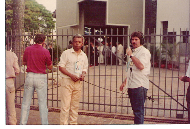 Papa João Paulo II em MS, repórteres Gomes da Costa e Armando Anache: Quinta-feira, 17 de outubro de 1991: Ao fundo, o Papa João Paulo II deixa a igreja de Santo Antonio, em Campo Grande, Mato Grosso do Sul, depois de celebrar missa; em primeiro plano - no tempo em que não existiam celulares - repórteres Gomes da Costa e Armando Anache, da CPN (Central Pantaneira de Notícias), transmitem ao vivo para as rádios Clube de Corumbá e Independente de Aquidauana.