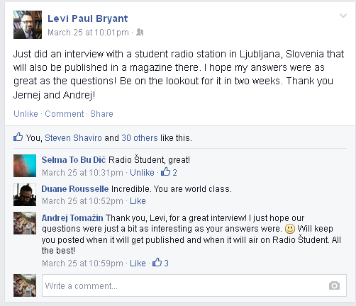 Z Jernejem sva napravila intervju s filozofom spekulativnega realizma oz. objektno orientirane ontologije, Levijem R. Bryantom. Razdelila sva ga na dva dela. Prvi govori o filozofu in njegovi metodi in njegovim vplivom in njegovi individuaciji in njegovi filozofiji. Drugi del, ki bo na sporedu v naslednji ediciji oddaje Otitis Media (STAY TUNED!), bo prinesel vprašanja o političnosti njegovega ontološkega projekta in se še globlje poglobil v osnovne premise objektno orientirane ontologije oz. strojno orientirane ontologije, kakor svojo filozofijo Bryant imenuje sedaj.