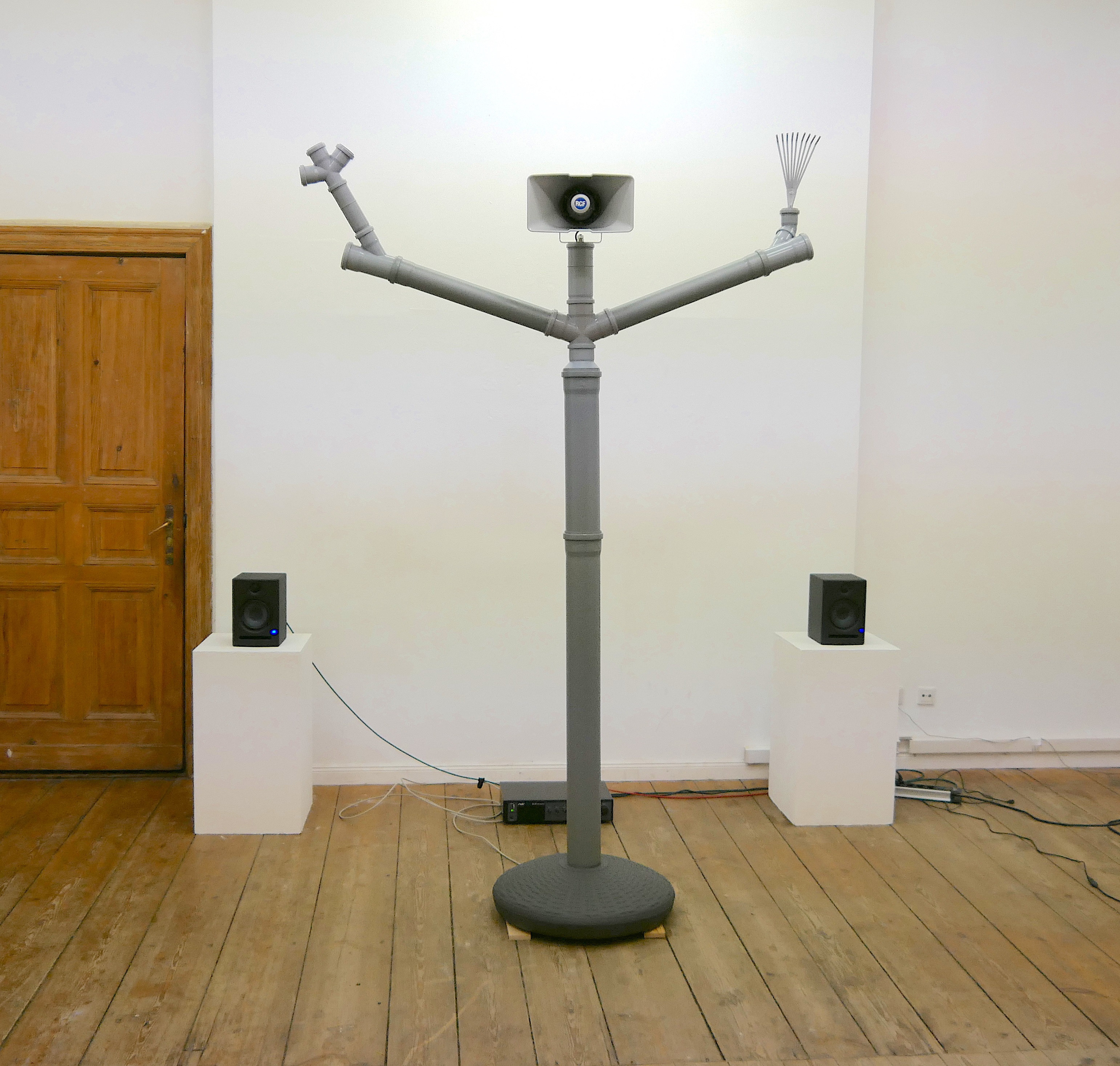 Korhan Erel made three computer voices spread over two speakers read this essay in parts. In between these parts, they inserted short sound compositions reminiscent of the computer sounds of the era, found-sound collages, snippets from Michel Foucault’s “The Culture of the Self” lectures at Berkeley (1983), and glitched versions of the manifesto in an effort to dig up and shine a new light on one of the first computer-era manifestos. The viewer experiences this sound piece by standing between two speakers pointed at each ear and in front of the printed manifesto.