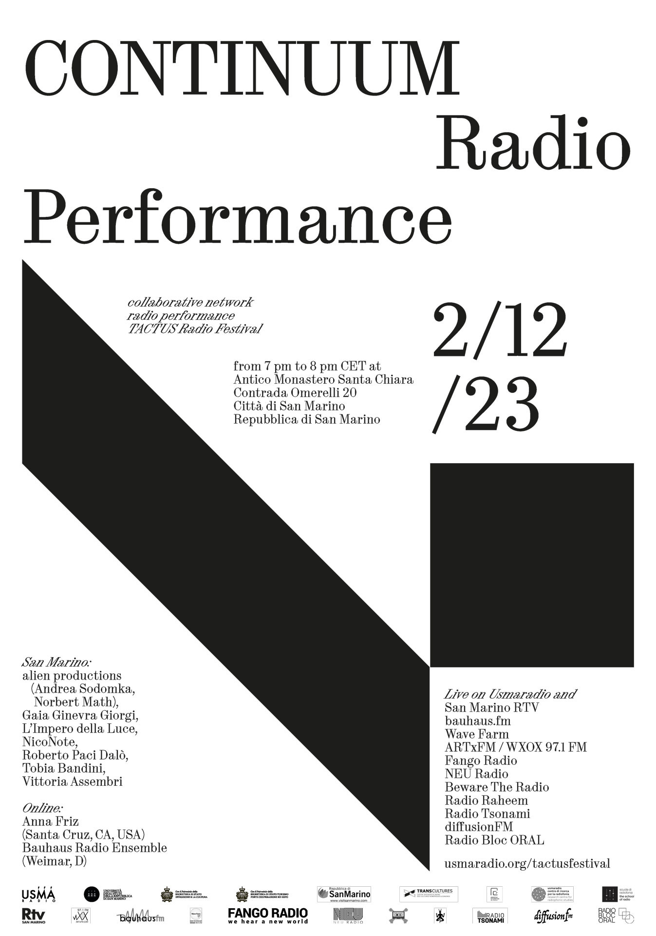 Partners: Experimentelles Radio an der Bauhaus-Universität Weimar, ORF Kunstradio, RaiPlay Sound, RTV San Marino, Giardini Pensili, Sentire le voci – festa del podcast, Wave Farm, Congerie, Smagliature Urbane, Radia, Arci Servizio Civile Rimini APS, Farmhouse Rimini, CUE Press, Tempo Reale, Radio Papesse, Fango Radio, Neu Radio, Radioimmaginaria, Radio Raheem, ARTxFM / WXOX 97.1 FM, Radio Tsonami, Beware The Radio, Transcultures/City Sonic 20 years and Pépinières Européennes de Création, Radio Campus Paris 93.9 FM, diffusionFM, Radio Bloc ORAL