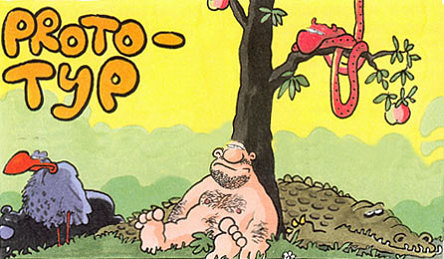 Kot se komercialni striparji radi lotevajo mož v pajkicah, se nekomercialni še raje lotevajo seksa in religije. Včasih tudi obojega hkrati. Religijska tematika, natančneje starozavezna Geneza, se v striparski obliki pojavlja pogosto. Med bolj znanimi je verjetno album The Genesis velemojstra Roberta Crumba iz leta 2009, ki so ga naslavljali s pridevniki, kot je kontroverzno, zgolj zaradi nekaj panelov prikaza spolnih odnosov. Crumb se vseeno teme loteva precej resno. Pri nas smo satirično podobo raja dobili leta 2013 izpod peresa Izarja Lunačka z naslovom Izgubljeni raj. Tudi tokrat obravnavan strip Prototip Ralfa Kőniga, katerega prevod smo dobili proti koncu lanskega leta, se zadeve loteva precej cinično.