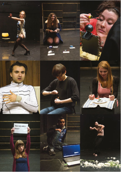 Igralci, ki to niso, vznikajo in izginjajo po prostoru, ustvarjajoč žive slike, bolj ali manj močne in manj ali bolj nemočne kompozicijske strukture. Te pa črpajo iz nabora elementov uzgodovinjenih performativnih tehnik. Fragmentarnost in zlomljenost naracije sledi fluidnosti in izmuzljivosti sleherne identitete. Defiksacija pogleda sovpade z defiksacijo in decentralizacijo odra. Vsakokrat pa iz horizontale v vertikalo požene temporalen podij. Nekje vznikne golo žensko telo, nedvomno nenormativno, poudarjeno narcistično in partikularizirano, ki strateško vztraja pri pogojenosti tega telesa s telesom gledalca. Na drugem koncu izčrpano telo »tako mlade, pa že Ukrajinke« vztraja na ponavljajočem dviganju telesa v stojo, ob tem pa vsakokrat dvignjeno krilo izriše slovensko zastavo. Akt se izteče v napis »Zdaj sem končno Slovenka«. Ob strani stoji stojnica ukradene hrane, ki ponuja obložene kruhke, ob njej, kako pričakovano, stoji mladi mož, zagotovo indijskega rodu. Spet nekje drugje pa se mlad moški nameni obračunati z nekaterimi podobami pop zvezd.