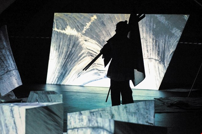 Že sam naslov predstave napove, da se bomo sprehajali po osvobojenih pokrajinah. Gledalčev fokus v mali dvorani mladinca na začetku predstave beži proti beli leseni kocki, na kateri valoví projicirano morje. S tem smo že pred samim dogajanjem na odru, ki je razporejen po celem prostoru, takoj postavljeni v opazovanje ali kar muzejsko gledanje monumentalnosti. Ta je upodobljena kot neobdelan in neoblikovan objekt, da pa gre za materializirano idejo spomenika kolektivnega spomina, ugotovimo, ko se igralke Katarina Stegnar, Vida Rucli in Damjana Černe lotijo njegovega razstavljanja.