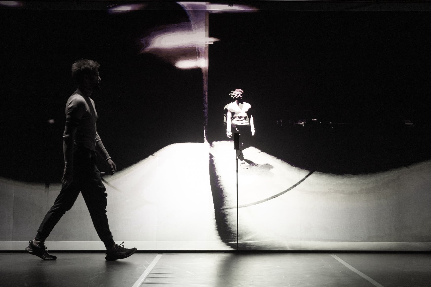 Vrhunec večera zagotovo predstavljajo trenutki, ko trojica plesalcev odstopi od plesa pred zastorom in za njim ter se v poetičnih trenutkih ukvarja z njim. Pretočna projekcija predstavlja najbolj atraktiven in unikaten del predstave, vendar lahko zaradi svoje novitete hitro izzveni zgolj na tej ravni. Čeprav odnos do nje ni povsem opredeljen, pa je najbolj eksplicitno obravnavan, ko Magdalena Reiter denimo poklekne pred platno in mislimo, da opazuje svojo senco. Vlogo slednje pa s presenetljivo prepričljivostjo odigra Chmielewska oziroma njena silhueta, ki za zastorom lovi gibanje soplesalke. Podoben moment je prisoten tudi proti zaključku, ko Chmielewska stoji za zastorom, vendar ne vidimo nje same, temveč njeno silhueto ter zrcalno projekcijo, ki med seboj poskušata navezati stik, to pa v kombinaciji s časoma - zaradi svoje vztrajnosti - anksioznim, vendar načeloma evokativnim scorom Radosława Dude na občinstvu pusti močan učinek. Krhkost slednjega dejanja lepo opiše Lemov citat: Stik pomeni izmenjavo nekih izkušenj, pojmov, če ne drugega, vsaj rezultatov, kakšnih stanj, ampak kaj pa, če ni kaj izmenjati?