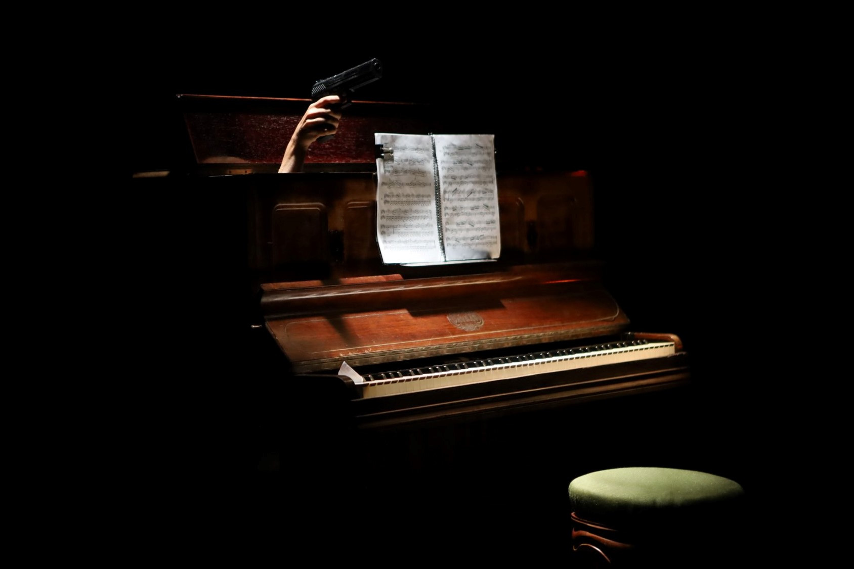 Racionalna logika dogodkov se počasi razkraja, ko enako oblečeni dekleti s praznim pogledom hodita v krogu s počasnim plesnim korakom; ko med igranjem dekleta na pianino njena dvojnica pade iz škatle; ko enako oblečeni dekleti s praznim pogledom hodita v krogu s počasnim plesnim korakom; ko napis »deja-vu« spet pade s stojala. Dogodke, ki smo jih že videli, vidimo znova in naš občutek za čas postaja nezanesljiv. Ob zatemnitvah med prizori nikoli ne vemo, ali se je predstava že končala ali sledi nov odsek nelogičnega plastenja materiala, v katerem izza številnih zaves in kotov vznikajo nove dvojnice nastopajoče.