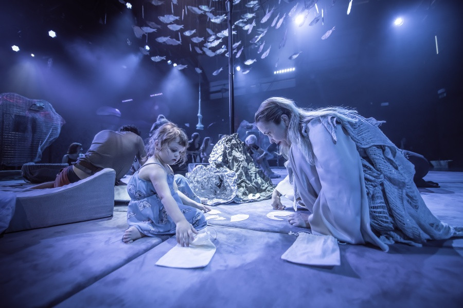 Interaktivna predstava Slišati morje je vzniknila pod taktirko avtorice in režiserke Saške Rakef. Namesto na sedeže dvorane smo povabljeni, da se bosi pridružimo igralki Maji Kunšič na morski jasi. Pod pridušenimi lučmi stopamo do mehke jase. Nad nami se v krogu počasi vrti jata rib in če prisluhnemo, že slišimo morje. Vsi ti elementi soustvarjajo pomirjujoče vzdušje in občutek varnosti.