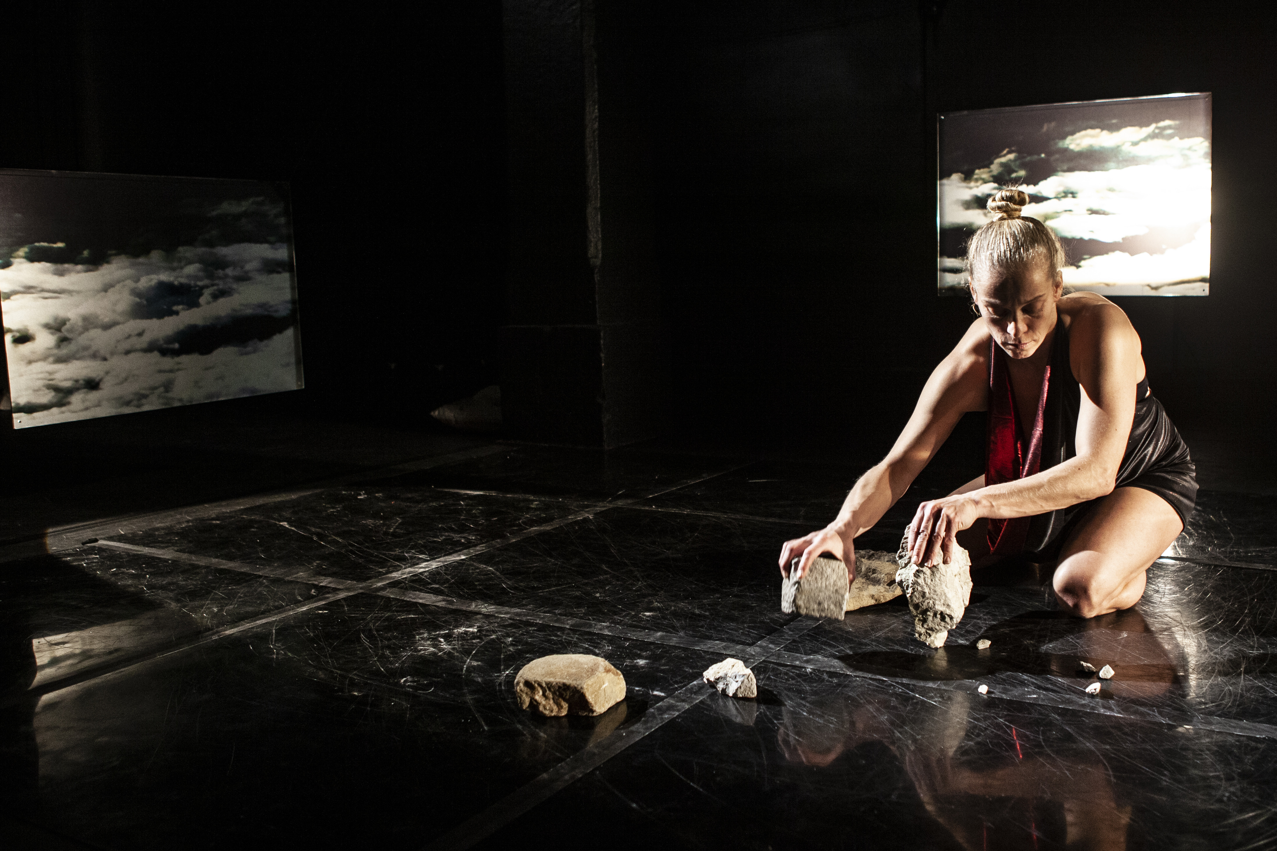 S stebri zamejen odrski prostor Gledališča Glej uokvirjajo viseča ogledala s potiskom oblakov. Na tleh ležijo kamni – v kotu kup manjših, po prostoru nekaj večjih, eden od njih se kasneje izkaže za osrednjega protagonista predstave. Avditorij končno spet poln - kamene prezence. Jurišić v zanjo zdaj že značilni glamurozni svetleči obleki – tokrat je rdeče-črna in kratka – sedi na tleh in se igra s prgiščem kamnov. V uvodu, ki postane leitmotiv predstave, človeška performerka kocka z majhnimi kamni, ki jih pretrese v dlaneh in zaluča po tleh. Glede na to, kako padejo manjši, razvrsti v identično kompozicijo večje kamne in poleg umesti svoje telo. Se uleže zraven, počaka. Si ogleduje kompozicijo, čaka. In mi z njo.