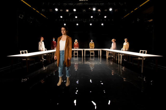 Nedoločnosti časa in prostora igre sledi tudi scena, ki jo preoblikujejo igralci sami. Mize zdaj predstavljajo institucionalno konferenčno dvorano, zdaj simbolno grmado. Na vrhuncu predstave lepa Vida na njej sicer ne zgori, temveč skoraj konča na dnu reke, v katero skoči kar sama od sebe – hura za emancipacijo! Reka oziroma bazen sicer služi predvsem estetskemu učinku – do izraza namreč najbolj pride ob plesu, ki tudi sam nima jasne funkcije.