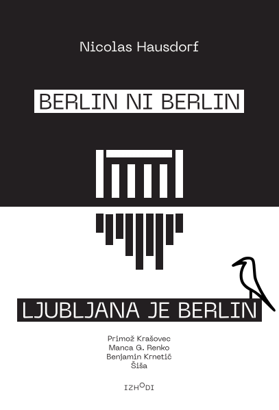 Tokrat je hišni oblikovalec zbirke Jaka Neon moral izdelati nekaj, kar je v razmerju do ostalih naslovnic v zbirki nekoliko flat. Takšna je bila, si predstavljamo, zahteva enega mema. Jukstapozicija logotipa Kluba K4 in stiliziranega Berghaina je neposredna. Morebitno dobrodošlo zmedo glede tega, ali gre pravzaprav za še kaj drugega, spoila najprej naslov in dalje številne variacije na isti sklic. V Cukrarni na pop večeru ob izidu knjižice, kjer so avtorji ljubljanskih prilog in člani ansambla SBO skupaj brali odlomke, je bilo že jasno, da je zadeva prekužena z memom, ki je na svojem zadnjem vrhuncu pred dobrima dvema letoma v zaprti in družabni Ljubljani v skladbi izrazil privilegirano temo naših zaprtih družb: Berlin ni Berlin, Ljubljana je Berlin.
