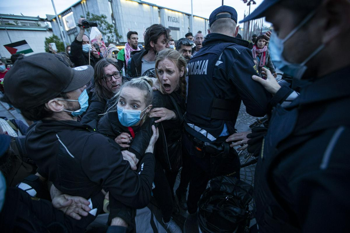 Na 57. protivladnih protestih, ki so se pričeli z nastopom Janševe koalicije, je prejšnji teden na Trgu republike prišlo do fizičnega obračunavanja med udeleženimi in policijo. Protestov so se po nedavnih obračunih med Izraelom in Palestino udeležili tudi podporniki Palestine ter Palestinci, živeči v Sloveniji. Policisti so poleg uporabe fizične sile odvzeli prostost dvema osebama zaradi suma storitve kaznivega dejanja, med drugimi pa so oglobili tudi Palestince. Skupščina je včeraj na novinarski konferenci pred ministrstvom za notranje zadeve oznanila, da bo proti policiji zaradi uporabe prekomerne sile vložila ovadbo. Tea Jarc, predsednica sidnikata Mladi Plus in članica protestne skupščine, opiše dogajanje prejšnji teden.
