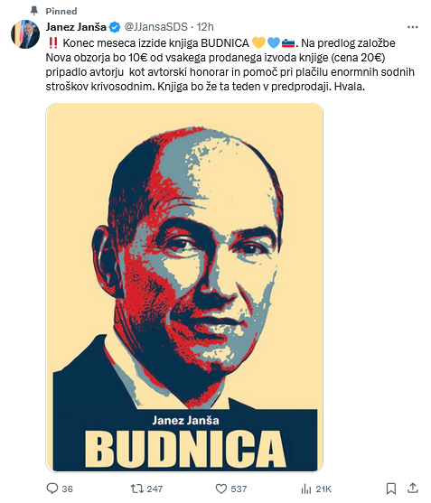 Niti SDS niti Janez Janša se zaenkrat na poziv pravosodne ministrice Andreje Katič ali prošnjo Slovenske tiskovne agencije za komentar še ne odzivata, je pa predsednik največje opozicijske stranke in že trikrat premier še naprej v svoji križarski, pravzaprav pa donkihotovski vojni proti, kot pravi, povampirjeni sodniški kasti in slovenskemu krivosodju, kar zaenkrat še vodi predvsem na domačih sodiščih in njemu še naprej najbolj ljubemu socialnemu omrežju X, na katerem so sicer tudi bile objavljene fotomontaže in naslovi sodnikov ter tožilke, Janša pa je na njem včeraj napovedal izid svoje nove knjige z naslovom Budnica. Na predlog hišne založbe SDS in njenega predsednika, založbe Nova obzorja, bo 10 evrov od vsakega prodanega izvoda, ki bo sicer stal 20 evrov, pripadlo avtorju kot avtorski honorar in pomoč pri plačilu enormnih sodnih stroškov krivosodnim oziroma sodnikom in tožilkam, ki jih je sicer Janša sam neuspešno sodno preganjal. Če pa bo nov knjižni izdelek prvaka opozicije prodajna uspešnica oziroma bo zbranih več sredstev, kot je zaenkrat stroškov krivosodja, bodo po besedah Janeza Janše ta namenjena za pomoč ostalim žrtvam političnih sodnih procesov.