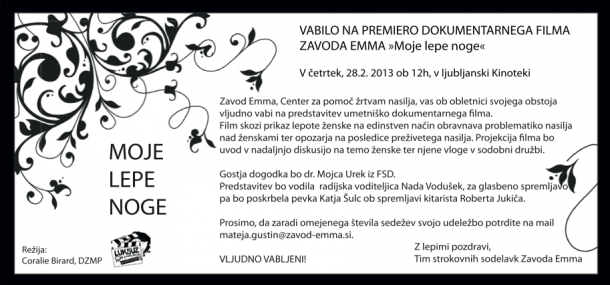 V kinotetki se je ob 12:00 predvajal dokumentaren film Zavoda Emma z naslovom Moje lepe noge. Film se ukvarja z nasiljem nad ženskami, več pa nam bo povedala Dževada Popaja, strokovna vodja programa zavoda Emma: