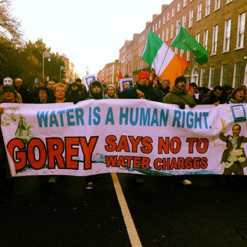 V Dublinu je potekal protest proti doplačilom za vodo. Več deset tisoč ljudi se je zbralo na ulicah in obdalo irski parlament. Zaradi poskusa uvedbe novih doplačil je na vedno bolj trhlih tleh trenutna vladna koalicija, vedno bolj pa podporo pridobivajo opozicijske stranke, s Sinn Fein na čelu. Kljub velikemu uporu načrtovanim spremembam s strani prebivalstva vlada vztraja na njihovi uvedbi. Odločili so se jih le delno znižati, zdaj bodo tako plačila znašala 1,15 evra na teden na osebo, oziroma tri evre na gospodinjstvo. Paul Murphy iz protivarčevalne zveze je pozval k neplačilu dodatka, ko aprila na naslove državljanov prispejo prve položnice. Prisluhnimo delu njegovega govora na protestu: