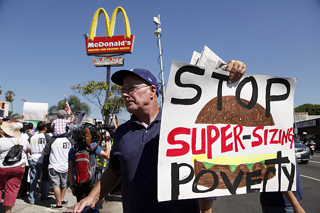 Aktivno stavkajoči in ne samo solidarni pa so delavci v restavracijah s hitro prehrano, ki so včeraj boj za svoje pravice popeljali na nov nivo. V ZDA se že dlje časa borijo za dvig plač, ki so trenutno na minimalni postavki 7,75 dolarja na uro, na 15 dolarjev. Včeraj so stavkali v več kot 150 mestih po ZDA, prvič pa so stavko razširili tudi v tujino. Solidarnost z njimi, kot tudi svoje nezadovoljstvo z delovnimi pogoji so s stavko izrazili delavci v več kot 30 državah. Prodaja hitre hrane v ZDA v zadnjem času upada, raste pa v vzpenjajočih se trgih po svetu, zato delavci skušajo udariti tam, kjer boli. Korporacije, ki obvladujejo okrpečevalnice s hitro prehrano, pa sporočajo: our way or the highway. V primeru povišanja plač, ki bi zarezalo v njihove profite, napovedujejo odpuščanje.