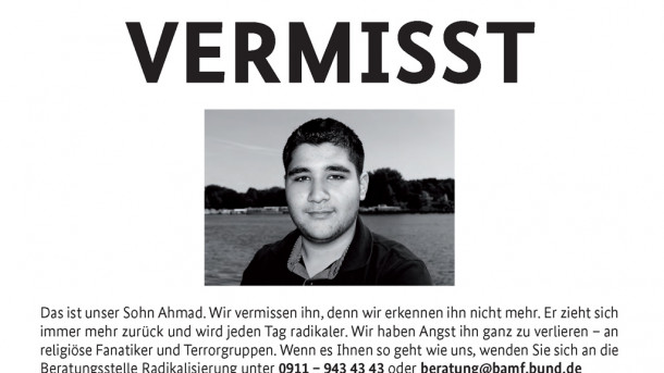 Muslimani, ki živijo v Nemčiji, so ogorčeni nad kampanjo, ki jo je sprožil nemški Antiradikalizacijski center, ustanovljen letos na ministrstvu za notranje zadeve. Kampanjo sestavljajo plakati, na katerih so slike štirih zagorelih mladeničev, nad njimi pa napis „Vermisst“, prevedeno „izginuli“. Pod sliko pa je napis. Na eni od različic tako piše, citiramo: „To je naš sin Ahmed. Pogrešamo ga, ker ga več ne prepoznamo. Zaprl se je vase in iz dneva v dan postaja vse bolj radikalen. Bojimo se, da ga bomo popolnoma izgubili in da se bo pridružil religioznim fanatikom in terorističnim skupinam“, konec citata. Plakati torej na zelo očiten način sugerirajo, da mladi vse bolj pogosto padajo pod vpliv islamskega ekstremizma. O kakšnih vzrokih ne duha ne sluha.