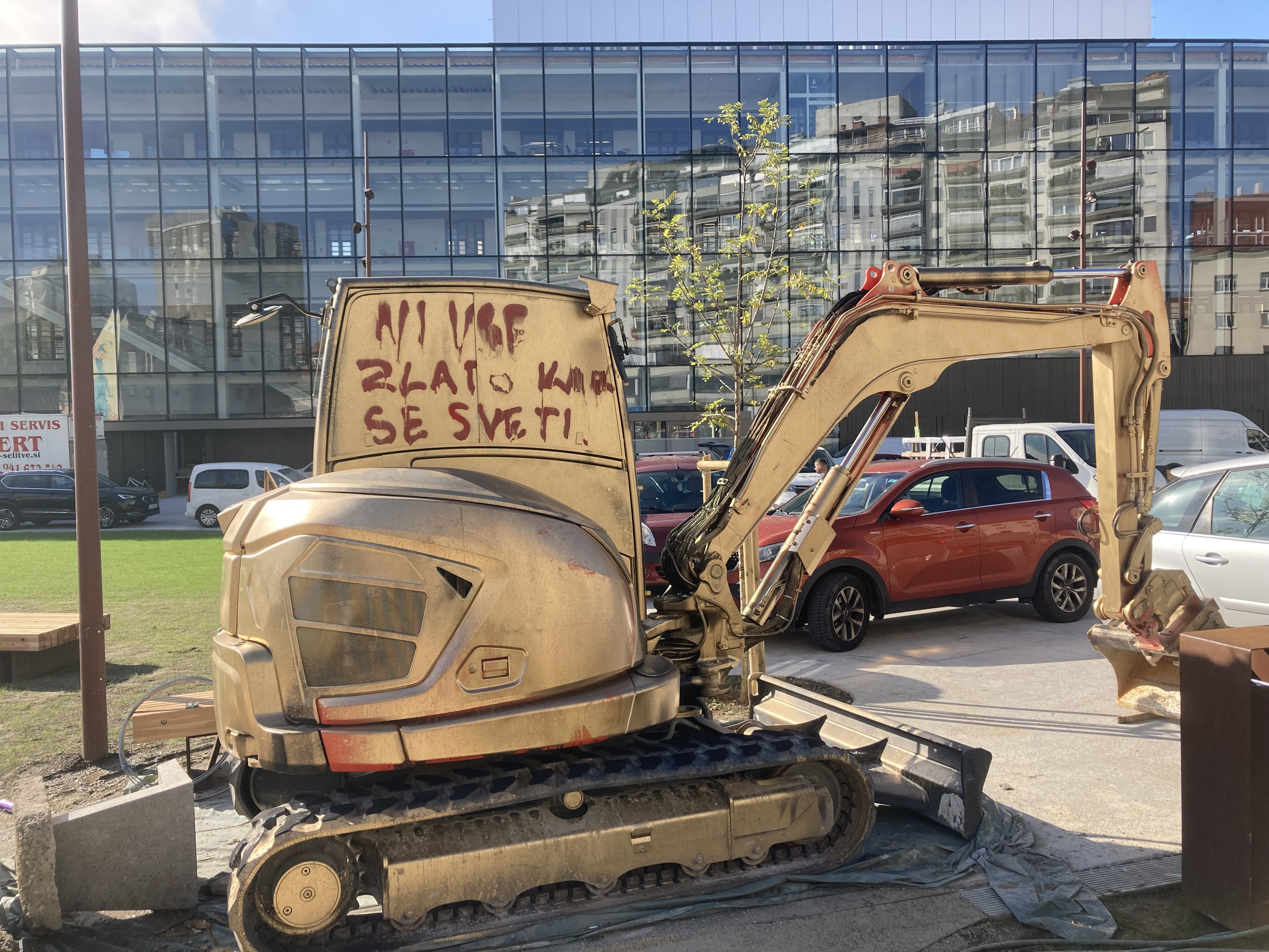 Neznanci so v referenci na neuspešen poskus evikcije Avtonomne tovarne Rog iz leta 2016 zdaj v zlato prebarvali bager, s katerim delavci izvajajo zaključna dela. Nanj so napisali: »Ni vse zlato, kar se sveti«.