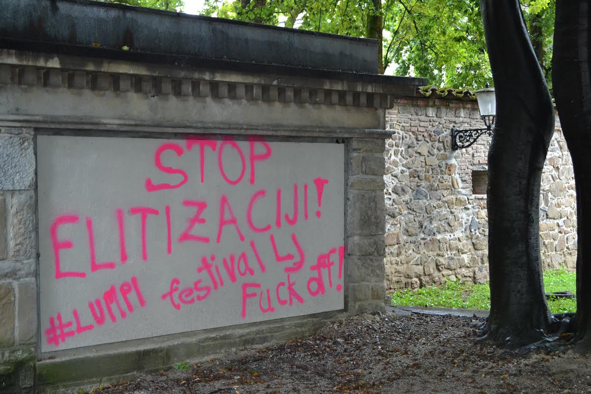 Od bedne odsotnosti relevantnih novic, ki vlada po svetu, se premikamo v temačna področja naše domovine, kjer je gejevski lobij zadal še enega izmed svojih zlodejnih udarcev proti kulturi in občečloveški morali. Da gre za gejevski lobij, predvidevamo po izboru roza barve, ki je lastna napisu, s katerim so oskrunili svetinjo ljubljanske kulture - Križanke. Ta je zadnje čase priča številnih napadov imoralistov, ki jim ni po godu, da Križanke v času Festivala Ljubljana niso dostopne postopačem in razbojnikom, ki iz čiste objestnosti bruhajo poceni vino po posvečenih zidovih tega kulturnega svetišča. Organizatorji festivala so letos namreč prepovedali posedanje pred Križankami v času koncertov. Zaprli so tudi peš cono. Lumpi so organizatorje festivala, zadnje branilce kulture, nepravično poimenovali z nazivom, ki bi lahko opisal le njih same - lump. Res velik zločin za tako majhno državo!