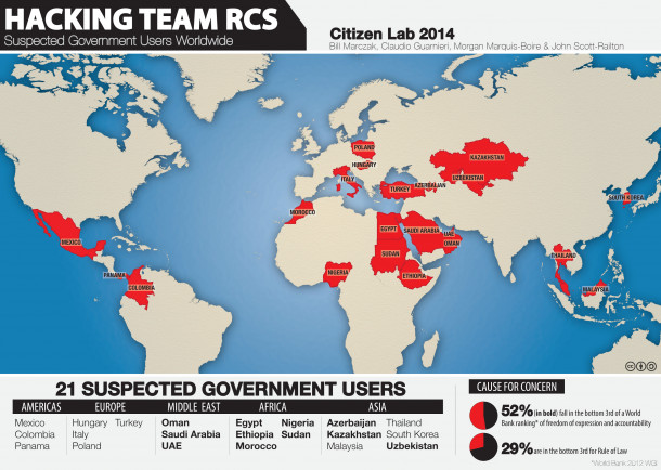 Revija Wired je v reportaži “Mapping Hacking Team’s Untraceable Spyware” ("Kartiranje uporabnikov hekerskih neizsledljivih spyware-ov") kot prva objavila podatke o vladah, ki uporabljajo software milanskega podjetja Hacking Team, proizvajalca hekerskih orodij za prestrezanje in nadziranje vseh aktivnosti, ki se odvijajo na nekem računalniku. Iz poročila je razvidno, da omenjene hekerske trojanske konje uporabljajo vlade vsaj 21 držav: Azerbajdžana, Kolumbije, Egipta, Etiopije, Madžarske, Kazakistana, Koreje, Malezije, Mehike, Maroka, Nigerije, Omana, Paname, Poljske, Savdske Arabije, Sudana, Tajske, Turčije, Združenih Arabskih Emiratov, Uzbekistana in Italije. Slovenije na seznamu zaenkrat še ni, čeprav lahko vladno vohunjene nad državljani po decemberskemu predlogu za spremembo zakonodaje, kmalu pričakujemo.
