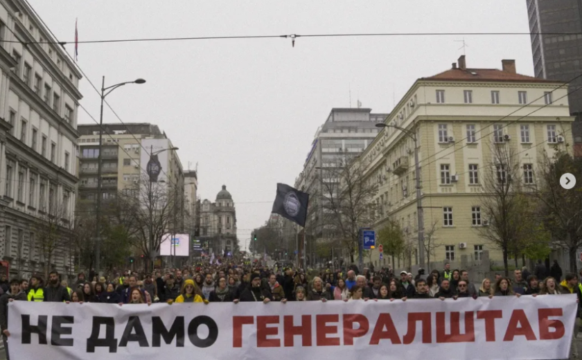 Sogovornik pojasnjuje, da se je danes pozornost usmerila na dogajanje zgolj par sto metrov stran, kjer so se pred zgradbo skupščine zbrali prebivalci v znak podpore gladovni stavki Dijane Hrka, materi sina, ki je umrl ob padcu nadstrešnice v Novem Sadu prejšnjega novembra. Protest so organizirali profesorji skupine Pobunjeni univerzitet. Hrka pred skupščino namreč stavka že enajsti dan.